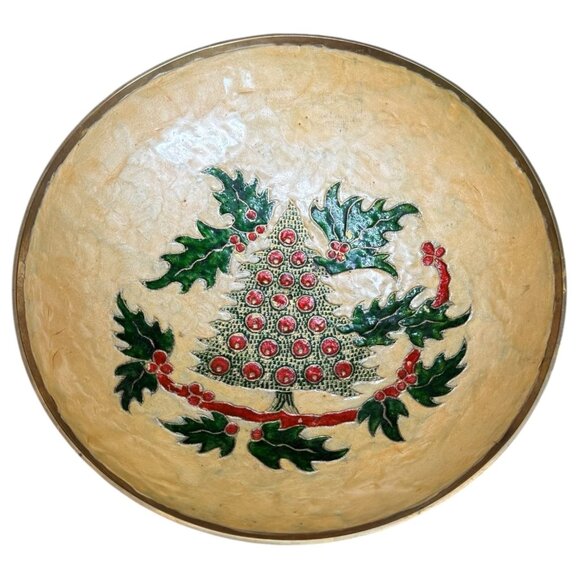 Vintage Enamel Cloisonne Christmas Tree Bowl 9" Holly Handcrafted Brass Pedestal