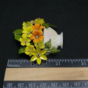 *Description: This is a great vintage enamel flower basket brooch with rhinestone centers; yellow and orange bouquet with green leaves in a white basket from the 1950s to 1960s. This designer flower bouquet is in an iridescent white basket. The flowers are riveted so they have a 3D effect as they extend out of the basket. There are rhinestones as flower centers. Enamel leaves also extend out from under the yellow and orange flowers. It would be a great brooch for spring or summer to add to a favorite jacket, hat, or bag. This would be a great addition to your vintage jewelry collection or make a great vintage gift!