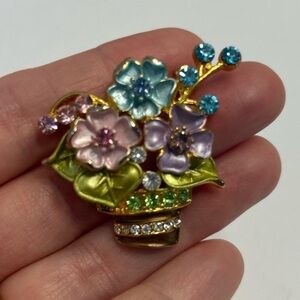 Vintage Enamel Flower Bouquet Pink Blue Green Rhinestone Brooch Gold Tone Pin