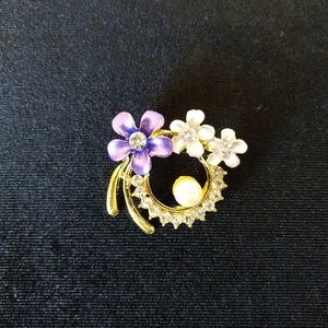 Beautiful brooch with enamel overlay on the petals of the flowers. A gorgeous pearl nestled in amongst the crystals, which is set on a beautiful yellow gold tone. Brooch is a brilliant quality, with the traditional pin backing.