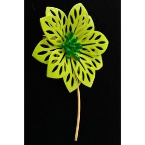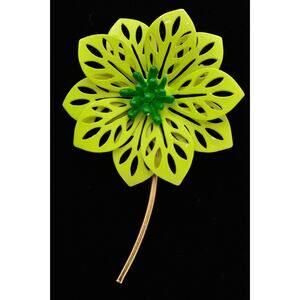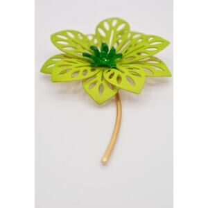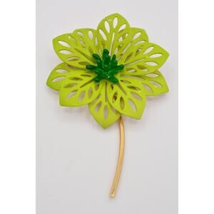 Vintage Enamel Flower Pin Brooch Green Gold Tone Large Chunky Big 1970s BinF