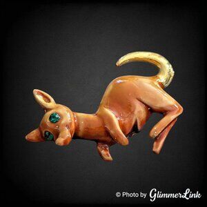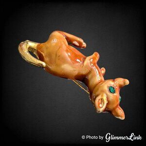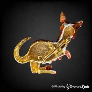 Vintage gold tone brooch featuring a brown enameled jumping kangaroo with green rhinestone eyes.