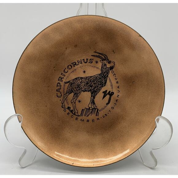 This vintage enamel on copper dish is a unique addition to any collection. With a size of 6 inches, it is perfect for storing trinkets or serving as a decorative piece. The dish features a stunning astrology zodiac design, depicting the goat, Capricorn, and other symbols.