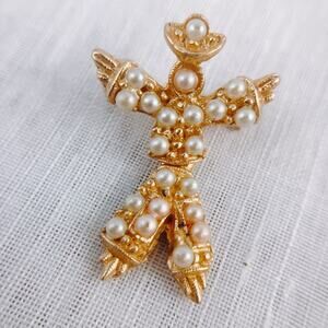 Materials: Gold-tone metal, enamel, faux pearls, red cabochon glass