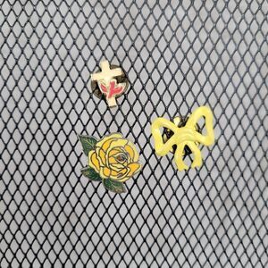 Charming enamel pin set. Includes a cross, a yellow rose, and a bow. Perfect for accessorizing.