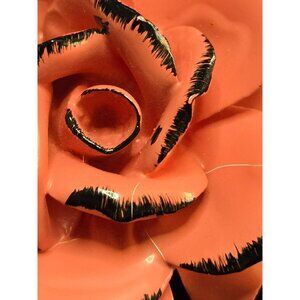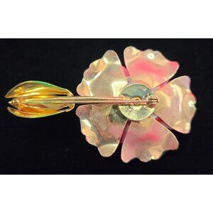 Vintage enamel pink rose and green leaf brooch. 3" x 2". There's one crack in the enamel on the flower- see pictures. Otherwise in good vintage condition.