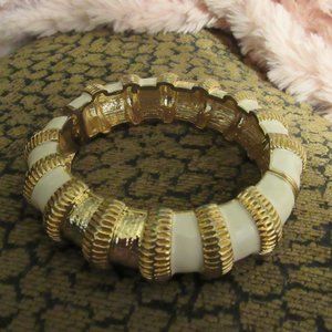 Here is an elegant and chic vintage cuff bracelet with rows of white enamel and rings of textured goldtone highlights. Hinged cuff style, magnetic clasp, 2 1/2" diameter, 5/8" wide. Any jewelry display forms or backgrounds are NOT included.