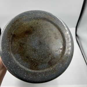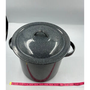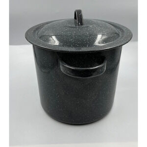 Vintage enamelware black with speckled / splatter white stock / soup pot medium size with lid, two handles. Pot has some wear on the bottom as pictured.