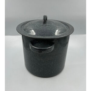 Vintage EnamelWare Black Speckled White Medium Stock Soup Pot W Lid