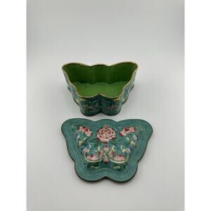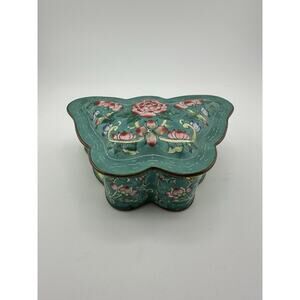 This vintage enameled cloisonne Chinese butterfly shaped trinket box is a handmade piece produced in China. Its intricate design reflects Chinese culture, making it a unique and collectible item. The brass mid-century construction adds to its charm, making it a standout piece for any collector interested in Asian cultures and ethnicities. It features pink flowers on a turquoise background. It has a made in China sticker on the bottom. It measures 2" tall, 5" long and 3" wide. It weighs 7 ounces. The lid lifts off, it is not hinged. The interior is green enamel. It is in very good vintage condition with no chips or damage.