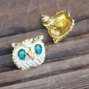 Vintage Enameled Cream Green Gold Owl Stud Earrings