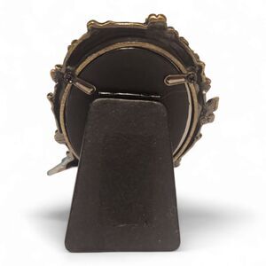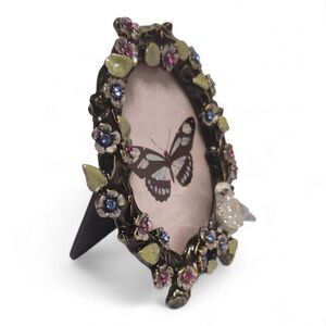 This beautiful vintage enameled and jeweled picture frame is a true statement piece! Featuring delicate floral accents, sparkling jewel embellishments, and a charming little blue bird, this ornate frame adds a touch of elegance and whimsy to any décor. Measures approximately 4 inches high, and includes a removable butterfly illustration inside, ready to be replaced with your own favorite photo.