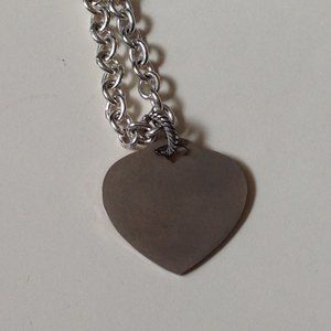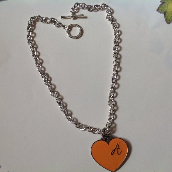Here is a vintage 1970s enamel heart necklace/pendant in neon orange with my initial. The enamel is covered with a layer of resin to prevent it from chipping and peeling. That was a great idea because this heart pendant looks new!! I didn’t like the ball chain it was on so I put it on this nice toggle chain, and that made it more of a necklace than a pendant! It is in excellent vintage condition!