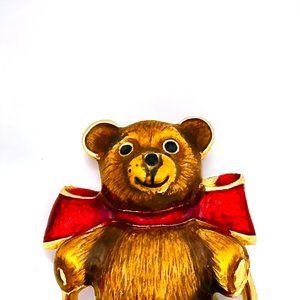 Vintage dimensional enameled teddy bear scarf clip. Enamel colors are great. Cute teddy bear with a big red bow. The scarf clip works well. Overall in very good vintage condition. The size is approx. 1.5" x 1.25"; Not signed.
