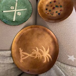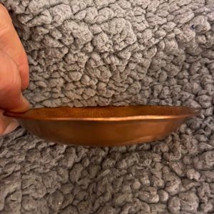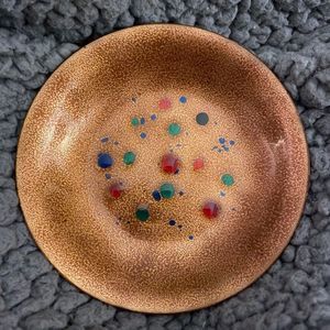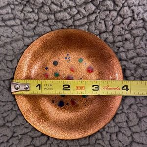 Vintage- Small trinket dish. Enameled copper, small round dish that can be used for jewelry, rings, small earrings. Copper with small splashes of colors of red, blue and green and with a copper back. Backside has some shading but otherwise excellent condition.