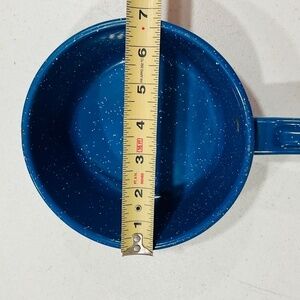 Vintage Enamelware Sauce Pan Blue White Speckled 1 Qt Primitive Camping Farmhouse Sauce pan pot. 6.5" DIAMETER. 2.5"tall. A small rust spot on inside of pot as pictured, otherwise very good condition. See pictures.