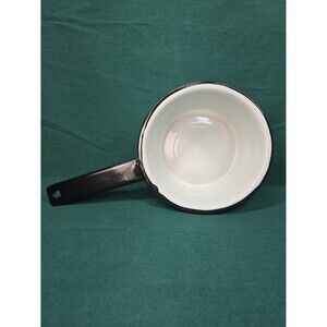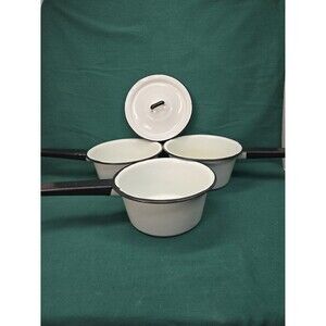 Vintage Enamelware White & Black Enamel 6" Pots Set of 3 with 1 Lid Sauce Soup