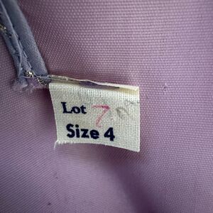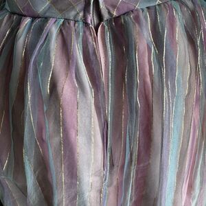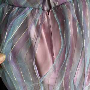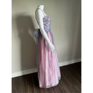 The most magical vintage gown, fairy princess, Cinderella, cupcake dress, rare style pink and purple with a plaid striped print, gold metallic outline, tulle overlay with lining, thin straps, bust has boning for support, a gorgeous bow that ties around high waist, this beauty is labeled a size 4, will fit best a size XS, fits my mannequin beautifully as she’s a size XS, measurements pit~pit 15”, high waist 17”, length 58” (measured top of strap to bottom hem) for how old this dress is it’s in excellent vintage condition, the only flaws are some ripping on the inner lining which does not show as the tulle covers it (pictured) also the back at waist the tulle is apart at the seam but does not show as when zipped and the back bow covers, I added the photos please see can be sewn as it’s the seam, feel free to message me anytime with questions!