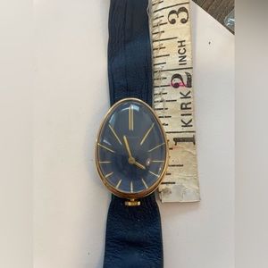 Vintage Swiss made and still keeping time! Wind up, navy face with gold tone accents and domed top. Some minor scraps but hardly noticeable. Could use a new band. Navy blue leather band with gold tone buckle. Watch is working and in wonderful condition considering it’s from 60’s. Endura was later bought by Swatch! Great quality.