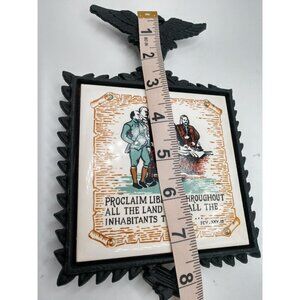 This decorative wall plaque features a cast iron eagle design with a ceramic tile insert showcasing a historic quote. Suitable for display in offices, classrooms, or homes.