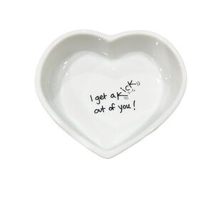 This vintage porcelain trinket box with art by Suzy Spafford features a heart-shaped design with a glazed finish. The box showcases the beloved character from Suzy's Zoo with the phrase "I get a kick out of you!" on the inside bottom of the box.