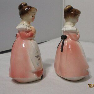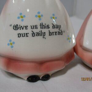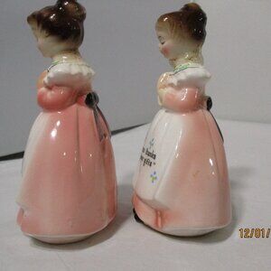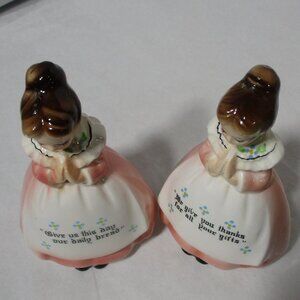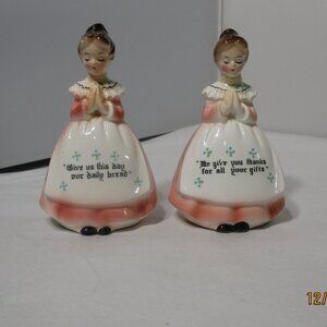 Vintage Enesco Praying Girls Ladies Salt & Pepper Pink Dresses. Give us This Day
