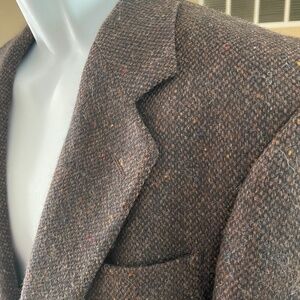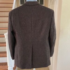 This is a nice sport coat/jacket by English Manor size 36 S. It is made from 100% wool and is a speckled tweed pattern in brown. All of the buttons are wooden, with three pockets on the outer and two inner pockets. The measurements from armpit to armpit is 20", from back of collar to end of jacket 28", from shoulder seam to shoulder seam across the back 17.5", and sleeve length from shoulder seam to end of cuff 23.5". It is in excellent condition.