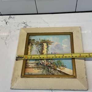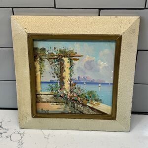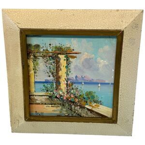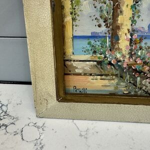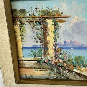 * Charming vintage oil painting on tile by artist Enzo Petrilli, depicting a European seaside café scene, likely in Italy. The painting is mounted in a wood frame, measuring approximately 6 inches. A wonderful piece of collectible Italian art with Mediterranean charm.