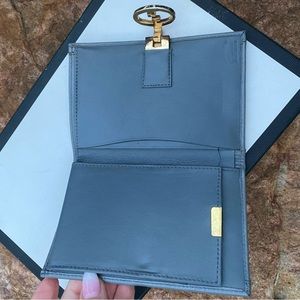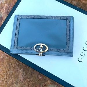 This is a super rare authentic GUCCI tri color clasp logo wallet in a stunning grey ! It’s got a bluish hue to it. The wall it opens up to a large flap that has a magnetic button on it. The other side has slots to put your cards and then you open up to put your money inside and when you close it it has a zippered space! So many different areas. Such a good time perfect wallet for your Gucci tote. This was made in 1960’s when Gucci extended their license out in Mexico . The only flaw I can see is the brass closure has a lil tarnish. See pictures . Super rare find ! Love these kind of pieces. Gucci shoe box not included for photo purposes only .