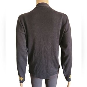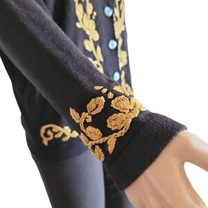 This cardigan is in excellent condition with no stains or holes. There is one part of the embroidery that is hanging out, but it seems contained (not unraveling further) and isnt very noticeable with in the style (it is pictured). It's a soft, black knit with gold colored embellishments. It's a V neck and buttons down the front.
