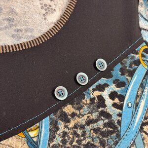 Vintage Bali, made in Canada, women’s top. Eye-catching mixed animal print design featuring leopard, snake, and tiger patterns with blue, tan, and gold tones. Accented with equestrian ropes and decorative buttons for a bold statement look. Has a soft stretch fabric for a comfortable and flattering fit. Great for fans of eclectic, artsy, or retro Y2K fashion.