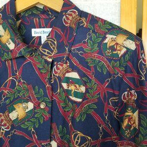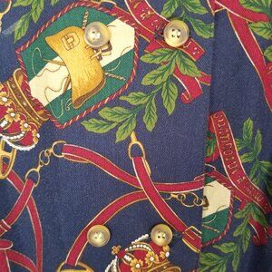 Vintage Equestrian Print Blouse Top Size 12 Long Sleeves Double Buttons