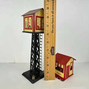 Charming vintage set featuring a tin litho signal tower with ladder and a small house. Vibrant red and yellow details.