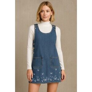 Adorable vintage-inspired Eric Charles denim jumper dress with sweet embroidered butterfly and floral detailing along the hem. A versatile piece that pairs perfectly with tees, blouses, or turtlenecks for a true Y2K/cottagecore vibe.