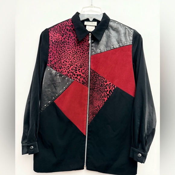 This Vintage 90’s Eric Ryan Sport shirt jacket features a striking combination of red and black colors, highlighted by an asymmetrical geometric patch design with leopard print and metal accents. The lightweight material and zip-up style make it an ideal choice for casual outings, offering both comfort and a modern yet retro aesthetic.