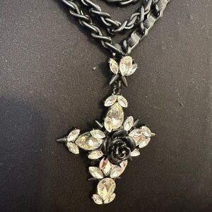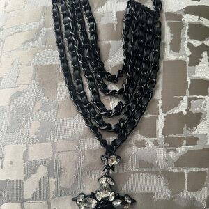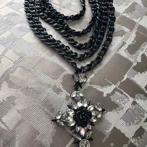 This Erickson Beamon necklace showcases a bold multi-strand design with glossy black chains, wrapped with black leather and a striking crystal pendant. The ornate pendant features a black center stone surrounded by sparkling crystals, creating a dramatic and elegant contrast.