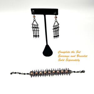 Pearls gone rogue? These Erickson Beamon-style masterpieces from a Gramercy Park jewelry boutique turn sweet into subversive. Single coral pearlescent beads crown a cascade of amethyst and black cut glass, creating a dramatic chandelier design that perfectly captures 90s zeitgeist—when costume jewelry broke all the rules and looked incredible doing it. Matching bracelet also available separately.