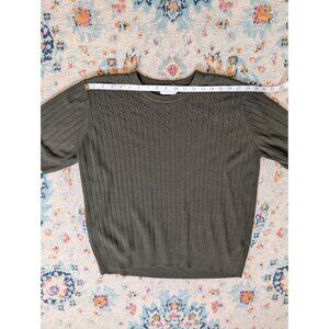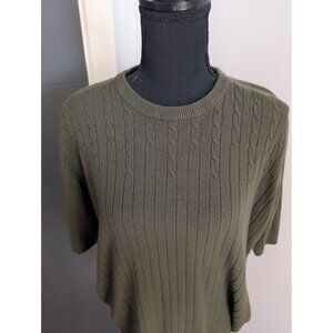 Short-sleeve olive green sweater with cable knit ribbed pattern and crew neck. Size tag has been removed, but fits like an XL/1X. See measurements below.