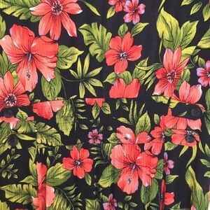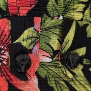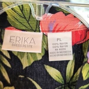 Vintage Erika 90's Floral Button Down Maxi Dress Size Petite Large. LP. This vintage dress has short sleeves and a shirt collar. There is a 3" elastic inset in the back with 4 faux button tabs. 10 button closure. The colors are black, pink and green. Dress has small shoulder pads that can easily be removed if you choose. Excellent Pre-Owned condition with no flaws.