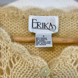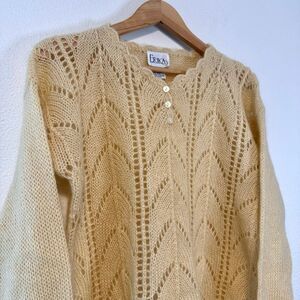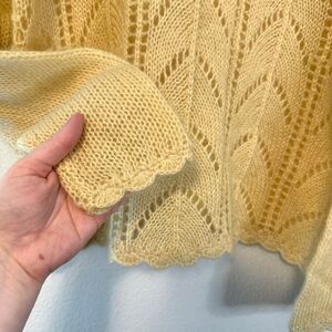 Size small. Neckline is scalloped edge and has a couple buttons. Pretty butter yellow. Mohair and acrylic blend. See images for details including measurements.