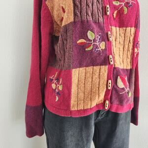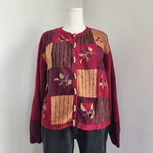 Vintage Erika Red Brown Fall Leaf Patchwork Knit Cardigan Sweater L/XL