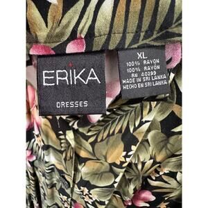 The Vintage Erika Size XL 1990s Pink Green Hibiscus Flowers Button Up Maxi Dress is a beautifully designed floral dress perfect for the summer, fall, and spring seasons. The sleeveless design, collared neckline, and long dress length give it a classic and elegant look. The multicolor pattern with vibrant pink and green hibiscus flowers adds a fun and tropical touch, ideal for a casual or dressed-up occasion. Made by the brand ERIKA, this vintage dress exudes a unique style that is sure to make a statement.