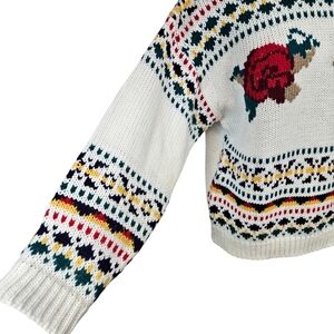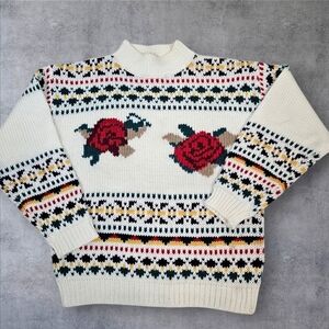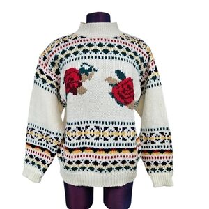 Features vintage 90s Erika heavyweight cottage pullover sweater, colorful fair isle print on a white tight knit fabric, 2 red roses across chest, mock turtleneck, boxy fit, long casual sleeve with ribbed cuffs, ribbed bottom hem, falls at hips, 90s vibes, ski lodge, grandma style.