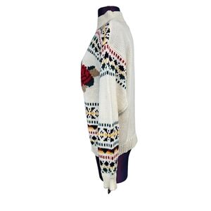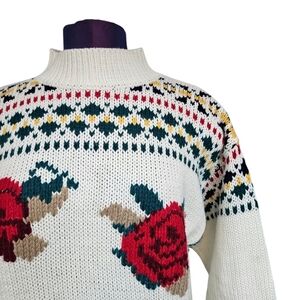 In excellent condition Vintage Erika White & Red Rose Fair Isle Mock Turtleneck Sweater Size Medium Women's.