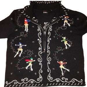 Vintage Erika Winter Sweater Beaded Embroidered Ice Skaters ZipUp L