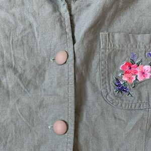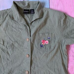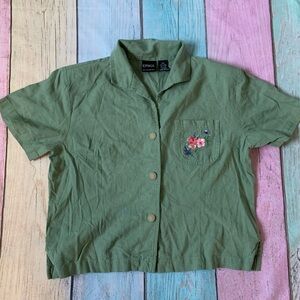 Elevate your casual wardrobe with button down shirt in a refreshing green hue. Crafted from a soft linen and rayon blend, it offers a relaxed fit and a classic collared neckline for everyday comfort. Perfect for laid-back outings, this shirt combines style and ease effortlessly. Size medium petite. In good vintage pre owned condition. Love the sage color on this! No stretch.