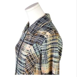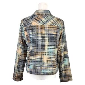 Add a touch of retro charm to your wardrobe with this vintage Erin London zip-front jacket, crafted from a soft and stretchy cotton-blend fabric. Featuring a unique multicolor plaid pattern in earthy tones of tan, black, and sage green, this classic piece offers a stylish, versatile look that’s perfect for layering across seasons. Designed with a collared neckline, long sleeves, and a flattering tailored silhouette, it closes with a branded zipper pull showcasing the Erin London logo for an extra pop of designer detail.