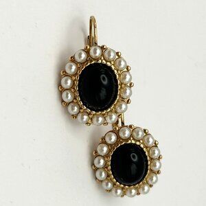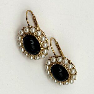 Vintage Erwin Pearl pierced earrings featuring a central black cabochon surrounded by faux pearls, set in gold tone frame. Signed on the back E. Pearl. Lever back style. Elegant and classic.