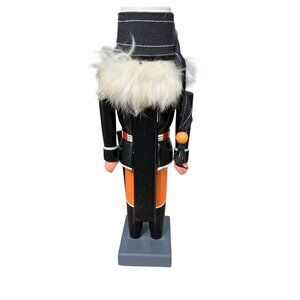 This handcrafted nutcracker features a detailed miner design, complete with a black and orange uniform and faux fur trim.