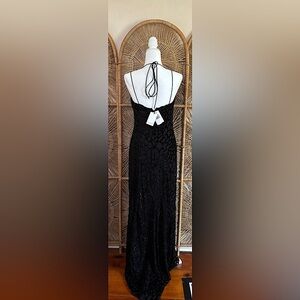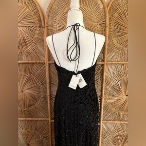 Slip style dress with spaghetti straps and halter tie around the neck. Material has a velvet patterns and is made from a viscose silk blend.